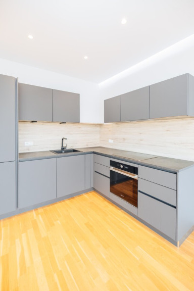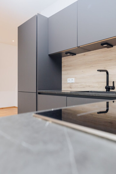 Schon beim Eintreten spüren Sie das besondere Ambiente: Ein eleganter Vorraum mit dezenten Deckenspots heißt Sie willkommen. Der großzügige Wohn-Essbereich mit integrierter Designer-Küche öffnet sich zur privaten Terrasse – ein sonniger Platz zum Durchatmen, Genießen oder Begrüßen von Gästen.