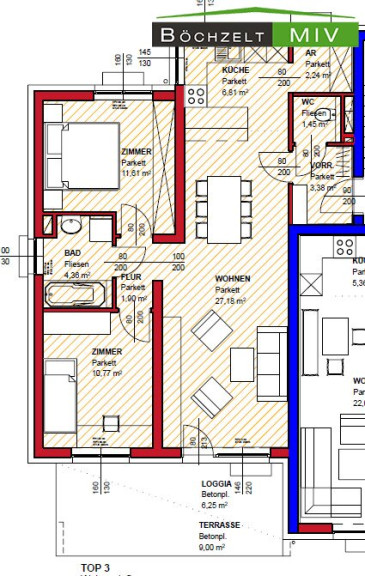 Die Wohnung teilt sich wie folgt auf: Vorraum, Küche mit Wohn-/Essbereich, Schlafzimmer, Kinderzimmer, Badezimmer mit Badewanne und Fenster, separates WC, Abstellraum und ein Balkon.
