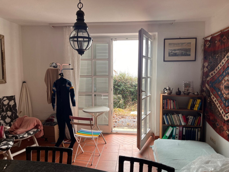Die Ein-Zimmer Wohnung selbst besteht aus einem kleinen Vorraum, einem BAD / WC Raum, sowie einem Wohn/Schlafzimmer, in dem auch die Anschlüsse für eine Kochnische vorhanden sind. Vom Wohnzimmer aus betritt man auch die südseitig ausgerichtete Terrasse. Über den terrassierten und prächtigen Garten mit herrlichen Altbaumbestand gelangt man direkt zum See (Luftlinie von der Wohnung zum See: ca. 50m!!) Im seenahen Gartenbereich befindet sich ein Naturdenkmal (Eiche) sowie ein Lagerplatz für Surfbretter. Von dort aus gelangt man auf den Steg bzw. zum hauseigenem Bootshaus.