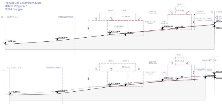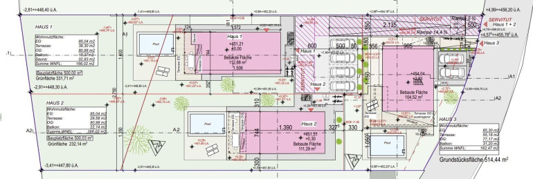 Durch eine Teilung des Gesamtgrundstückes in 3 Einzelparzellen entstehen 3 Grundstücke mit 515, 732 und 831m². Die derzeitige Planung sieht die Errichtung von hochwertigen Wohnhäusern (Wohnfläche ca. 150m²) in Holz-Massivbauweise durch einen Premium-Hersteller in einem modernen Chalet-Baustil vor. Um der Exklusivität der Gesamtanlage zu entsprechen wird eine repräsentative Einfriedung und Einfahrtssituation mit Tor/Sprechanlage vorgesehen. Die Allgemeinflächen werden mit Granit-Kopfsteinpflaster ausgeführt, eine großzügige gärtnerische Gestaltung im Bereich der KFZ-Stellplätze unterstreicht die Wertigkeit und Exklusivität der Gesamtanlage.