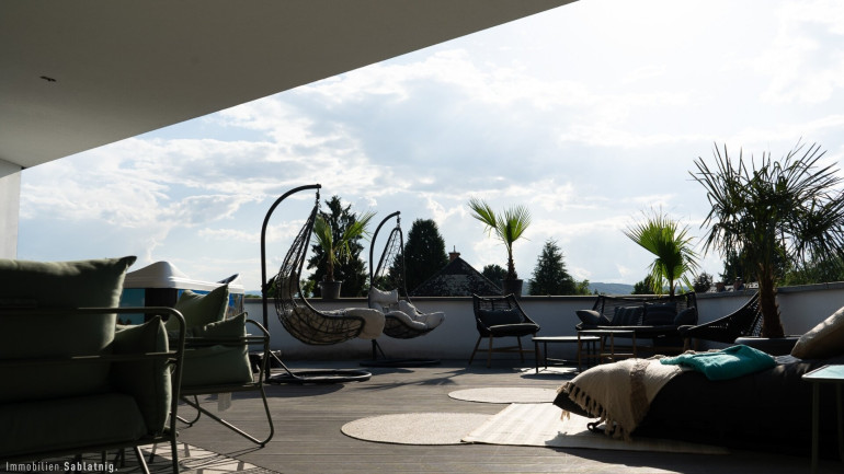 Ein absolutes Highlight ist die weitläufige Terrasse: mit Whirlpool, stilvollen Lounge-Bereichen und reichlich Platz zum Entspannen oder Repräsentieren.
