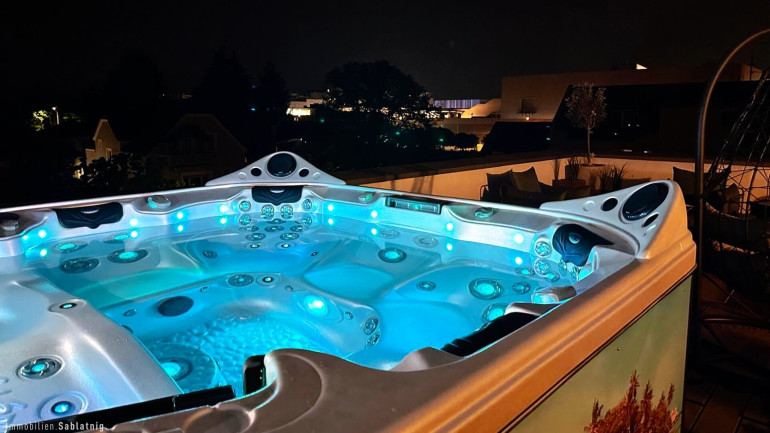 - SW Terrasse mit ca. 80 m² – inkl. Whirlpool und stilvollen Verweilplätzen