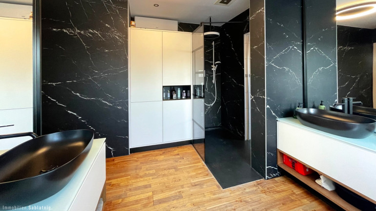 - Luxuriöses Badezimmer in Marmoroptik mit Doppelwaschbecken und Walk-in-Dusche