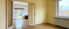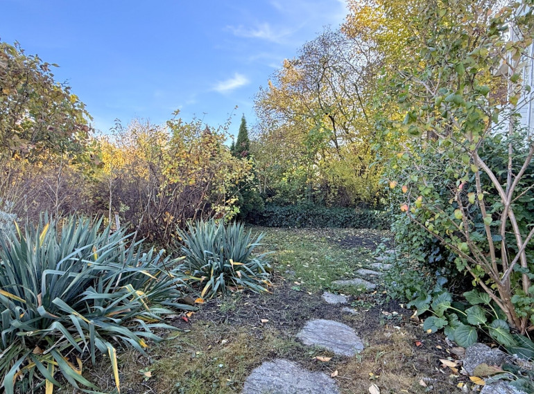 Rechts ein Zimmer mit klassischem Fischgrätparkett – früher vermutlich für Gespräche gedacht, die länger dauerten als geplant. Eine Doppeltür führt weiter zum Wohnzimmer, fast wie eine Einladung ohne Worte. Ebenfalls mit sonorem Fischgrät öffnet es sich zur Terrasse und weiter in den ebenen, sonnigen Garten. Nebenan ein erweiterter Wohnbereich mit großem Blumenfenster – der Blick verliert sich hier ganz von selbst im eigenen Grün.