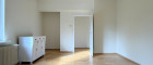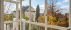 Rechts die Tür zum Balkon – der Blick Richtung Stadt ist großartig. Nah genug, um zu wissen, dass sie da ist. Weit genug, um sie nicht zu brauchen. Geradeaus ein kleineres Zimmer, daneben das große. Wieder dieser Blick in den Garten, wieder diese Ruhe. Vom Schlafzimmer direkt ins Badezimmer – Grau, Beige, Fenster, Licht. Kein Designstatement, kein Schauraum. Einfach ein Bad, das genau weiß, was es ist.