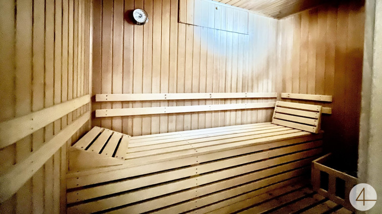 Fliesen, Steinboden, Parkett, Zentralheizung, Einbauküche, Bad mit Fenster, Badewanne, Dusche, Kabel/Satelliten-TV, Garage, Parkplatz, Sauna, Swimmingpool, Teeküche, Wasch/Trockenraum