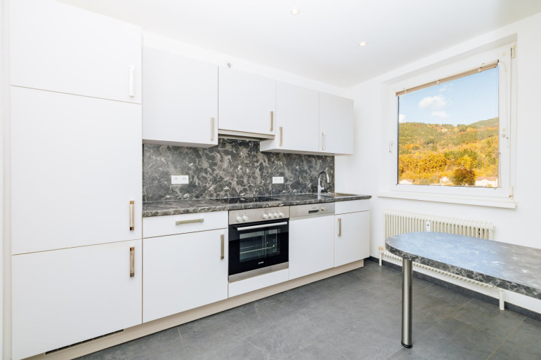 Durch die erhöhte Lage und die vielen Fenster genießt man ganztägig eine helle Wohnatmosphäre und einen weiten Blick über die Dächer von Leoben. - Separate Küche mit Vollausstattung