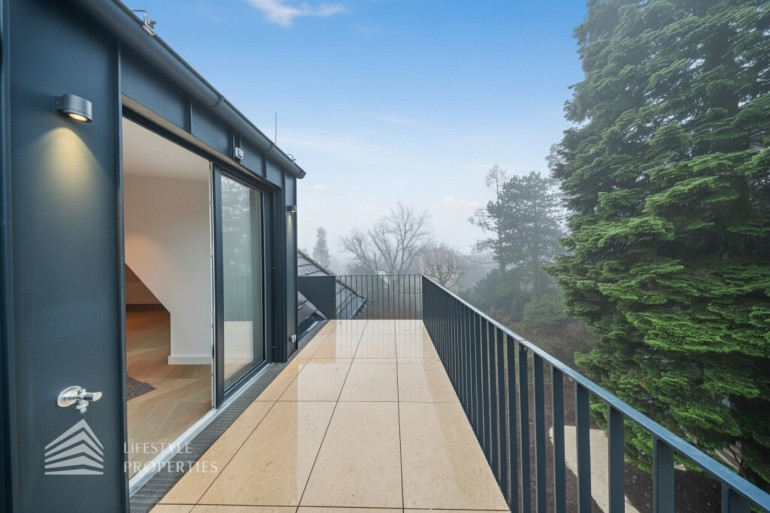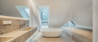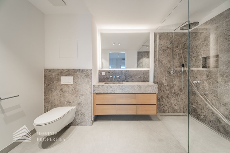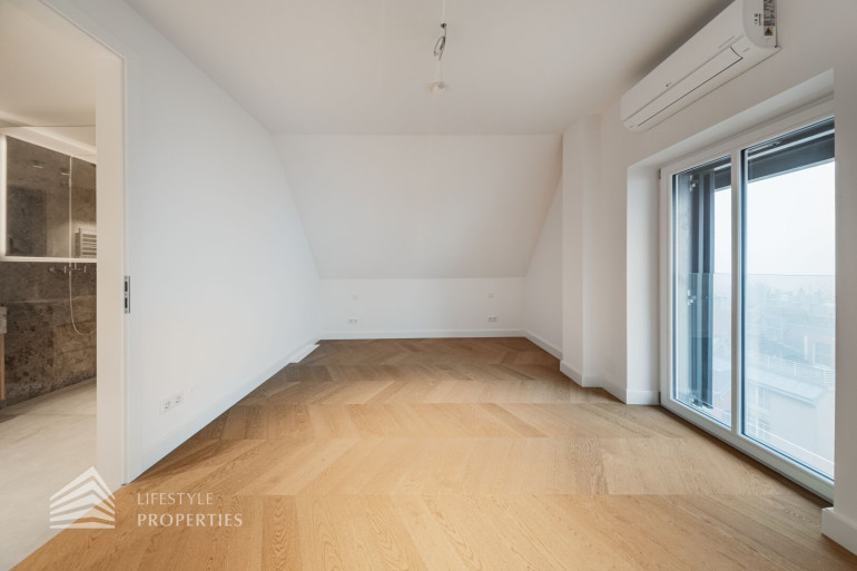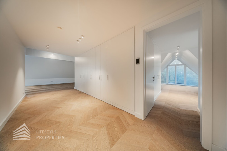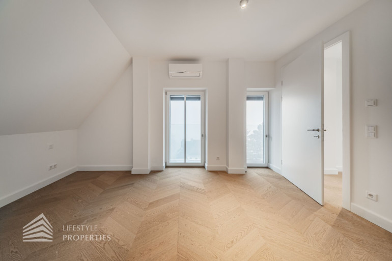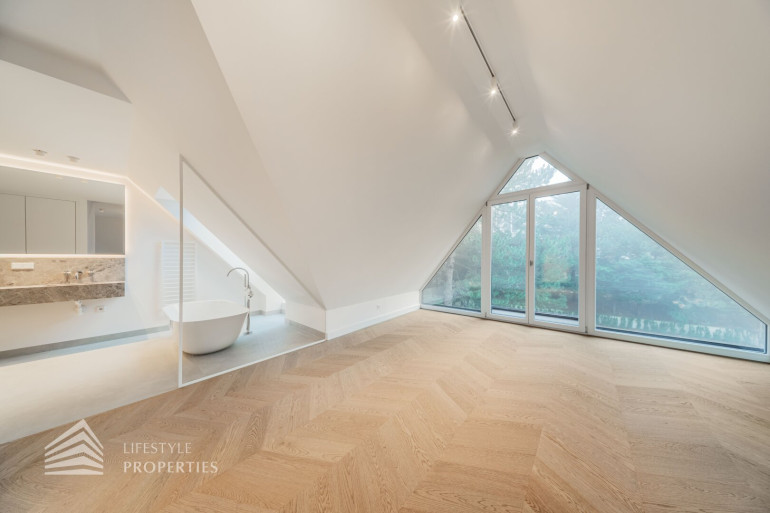 Auf derselben Ebene liegen zwei großzügige Schlafzimmer, die jeweils als eigenständige Rückzugsbereiche mit Badezimmer en suite ausgeführt sind. Ein Schlafzimmer verfügt über eine Fläche von ca. 16 m² und ist mit einem angeschlossenen Badezimmer von rund 7 m² ausgestattet. Das zweite Schlafzimmer präsentiert sich besonders großzügig und umfasst ca. 48 m² inklusive eines großen Badezimmers mit Badewanne, wodurch ein nahezu suite-artiger Wohnbereich entsteht, der höchsten Komfort und Privatsphäre bietet.