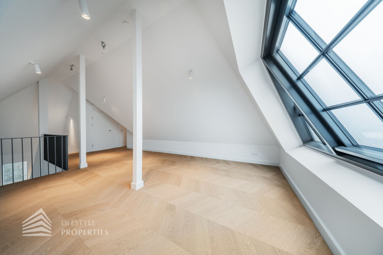 Über eine interne Treppe gelangt man in das Galeriegeschoss, das als zweite Wohnebene konzipiert ist und vielfältige Nutzungsmöglichkeiten eröffnet. Hier befindet sich ein großzügiger Wohnraum mit ca. 36 m², der sich ideal als zusätzlicher Aufenthaltsbereich, Bibliothek, Homeoffice oder Lounge eignet. Ergänzt wird diese Ebene durch ein separat begehbares Zimmer mit ca. 20 m², das flexibel als Schlaf-, Gäste- oder Arbeitszimmer genutzt werden kann, sowie durch ein Badezimmer mit ca. 5 m², das den Wohnkomfort auf dieser Ebene vollständig abrundet.