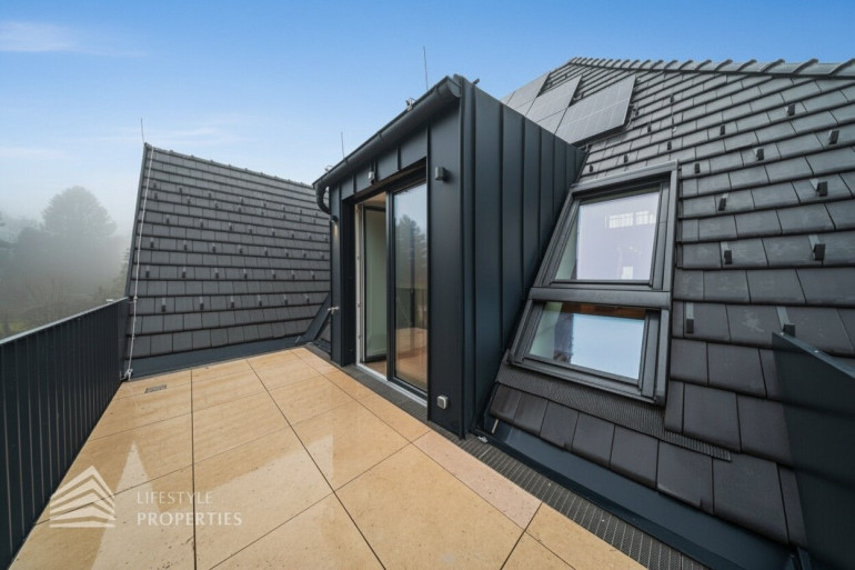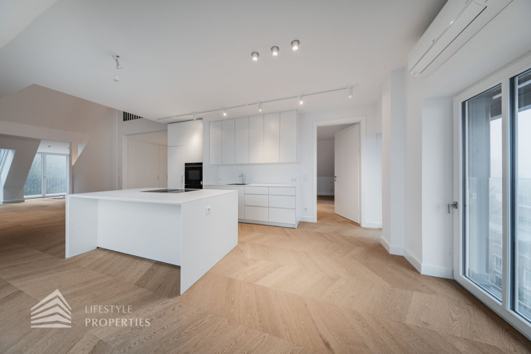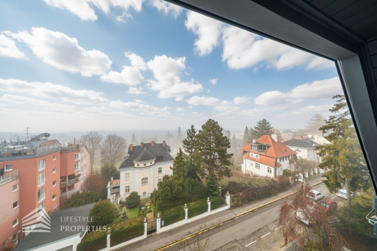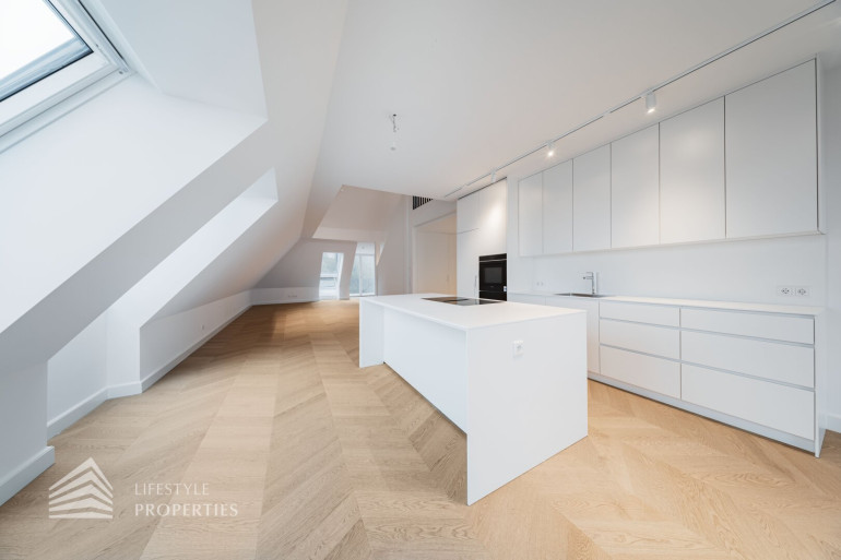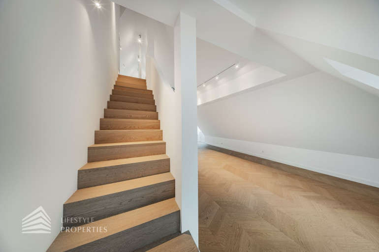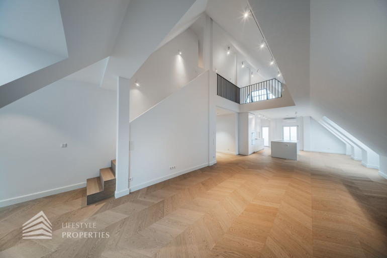 Diese außergewöhnliche Maisonette-Dachgeschosswohnung befindet sich in einer prachtvollen Jahrhundertwendevilla und bietet auf rund 238 m² Wohnfläche inklusive Galerie ein beeindruckendes Zusammenspiel aus Großzügigkeit, Licht und architektonischer Eleganz. Bereits beim Betreten des unteren Wohnbereichs eröffnet sich ein einladendes Entrée, von dem aus man direkt in den weitläufigen ca. 75m² grossen Wohnbereich mit offener Küche gelangt, der als kommunikatives Zentrum der Wohnung fungiert und durch seine Offenheit und Raumhöhe ein besonders hochwertiges Wohngefühl vermittelt. Von hier aus erschließt sich auch der Balkon mit rund 11 m², der den Wohnraum ins Freie erweitert und einen angenehmen privaten Rückzugsort bietet. Ergänzend befindet sich auf dieser Ebene ein separates Gäste-WC, das den Wohnkomfort im Alltag sowie bei Besuch zusätzlich erhöht.