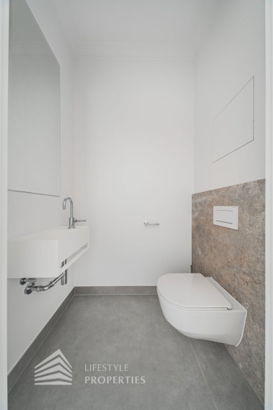 Ein separater Vorraum mit ca. 11 m² führt auf die gemütliche Loggia mit rund 8 m² und erschließt zudem ein Gäste-WC – ideal für Besucher und den repräsentativen Wohnalltag. Ergänzt wird das Raumangebot durch eine praktische Abstellkammer mit ca. 5 m².