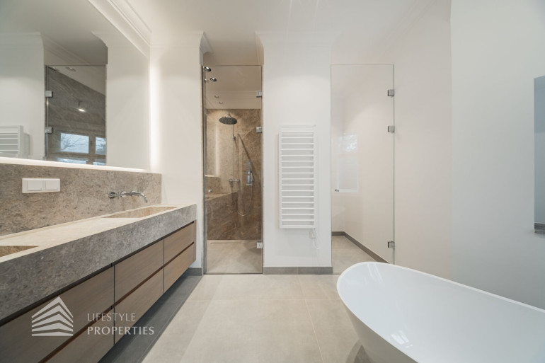 Die Wohnung wurde umfassend und mit höchstem Anspruch saniert. Edler Parkettboden in den Wohnräumen, hochwertiges Feinsteinzeug in den Nassbereichen sowie doppelte Fenster im klassischen Altbaustil unterstreichen den zeitlosen Charakter dieser Immobilie. Auf Wunsch kann ein Garagenstellplatz im Stapelparker angemietet werden und rundet das Angebot perfekt ab.