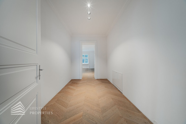 Bereits beim Betreten dieser außergewöhnlichen Altbauresidenz im ersten Obergeschoss offenbart sich ein Wohngefühl auf ca 197m² Wohnfläche und höchstem Niveau. Komfortabel über einen Personenaufzug erreichbar, empfängt ein großzügiges Entrée mit rund 10,5 m², das den Ton für die durchdachte Raumdramaturgie dieser exklusiven Wohnung angibt.