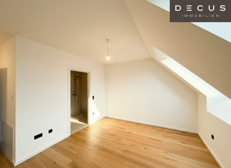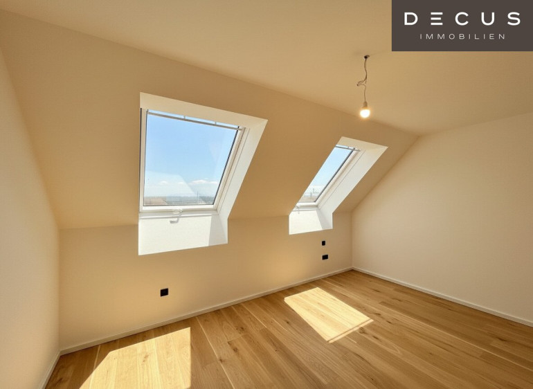 Im oberen Dachgeschoss befindet sich der offen gestaltete Wohn-, Koch- und Essbereich – ein heller, einladender Raum, der durch die große Terrasse nahtlos nach außen erweitert wird. Vom lichtdurchfluteten Wohnbereich aus eröffnet sich ein beeindruckender Ausblick auf die Gloriette, der dem Wohnraum eine ganz besondere Atmosphäre verleiht. Die großzügige Freifläche mit Lärche-Dielen bietet Platz für Lounge, Esstisch oder Pflanzen und schafft einen privaten Rückzugsort über den Dächern Penzings.