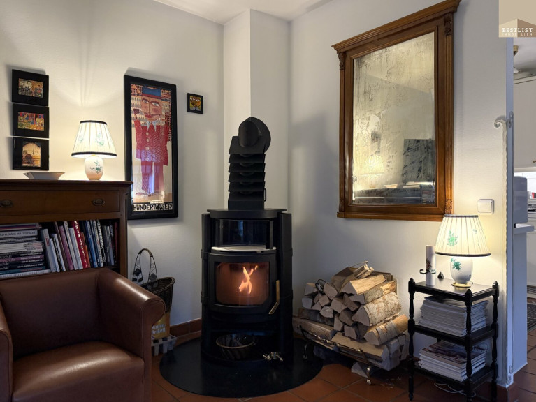 Hier stehen eine gemütliche Küche mit Schwedenofen, ein Essplatz, ein Wohnbereich, zwei Zimmer sowie ein Bad zur Verfügung. Besonders stimmungsvoll ist der Rundbogen, der Küche und Wohnbereich optisch voneinander trennt und gemeinsam mit dem Ofen eine sehr behagliche Wohnatmosphäre schafft.