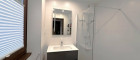 Über den Flur gelangt man zu zwei weiteren Schlafzimmern(ca. 11,55 + 18,55m²) , eines davon mit Zugang zur Terrasse (ca. 3,70m²). Zudem befinden sich hier ein Badezimmer (ca. 3,42m²) mit moderner bodengleicher Duschkabine sowie ein separates WC (ca.1,70m²). Das Flurfenster ist nordseitig ausgerichtet und bietet einen besonderen Blick auf die Burg Ruine Rauhenstein, die abends stimmungsvoll beleuchtet wird und so ein unvergleichliches Ambiente schafft.