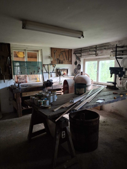 Im ebenfalls hier zu erreichenden Anbau finden Sie die Werkstatt und einen sehr großen Raum, der viele Möglichkeiten der Gestaltung bietet. Selbstverständlich gelangen Sie auch von hier aus in den Garten.