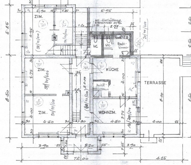Sie betreten das Haus durch einen später dazu gebauten Windfang, von dem aus Sie das Vorzimmer betreten. Weiter geht es in das Stiegenhaus. Von hier aus sind alle Räume des Erdgeschoßes zu begehen. Rechts findet sich der Frühstücksraum mit Ausgang auf die Terrasse und den Garten. Nebenan finden Sie die Küche mit Essbereich und einer kleinen Speise, auch von hier aus gelangen Sie auf die Terrasse und in den Garten. Das Badezimmer ist ebenfalls von der Küche aus zu begehen, man kann aber sehr leicht einen Eingang vom Vorzimmer aus schaffen. Gegenüber befinden sich zwei Zimmer mit einer Verbindungstüre.