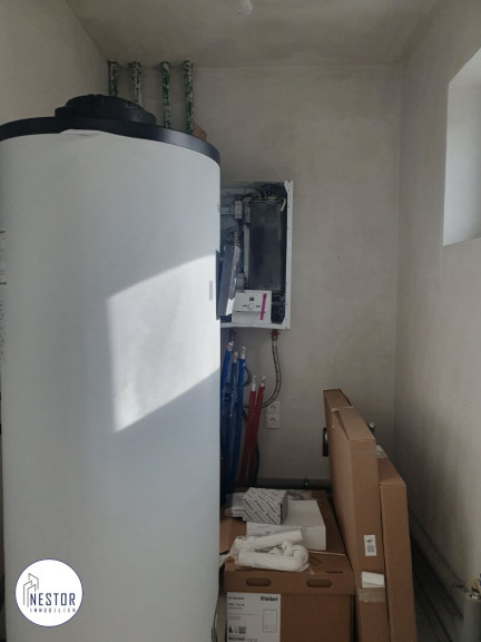 - Das Haus wird durch eine Luftwärmepumpe beheizt.