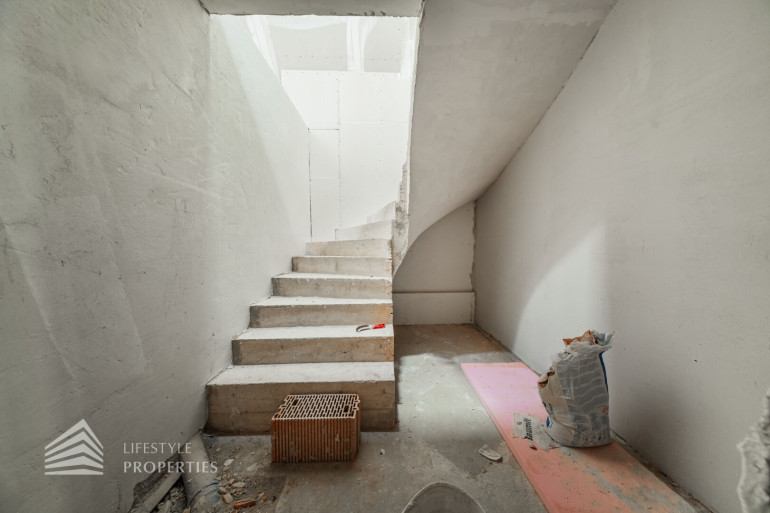 Im unteren Geschoss vom sogenannten Townhouse befinden sich zwei Schlafzimmer, ein geräumiger Vorraum, ein Abstellraum, sowie ein Badezimmer mit Badewanne, Waschbecken, Waschmaschinenanschluss und separater Toilette. Über eine Treppe gelangen Sie in das obere Stockwerk, das in einen großzügigen Wohnbereich mit Küchenanschlüssen sowie ein weiteres Zimmer aufteilt. Von diesem Zimmer aus gelangt man zu einer Terrasse. Der Wohnbereich hat Zugang zu einem rund 13 m² großen Balkon mit schönem Hofblick. Zusätzlich befindet sich im oberen Stockwerk ein weiteres WC.