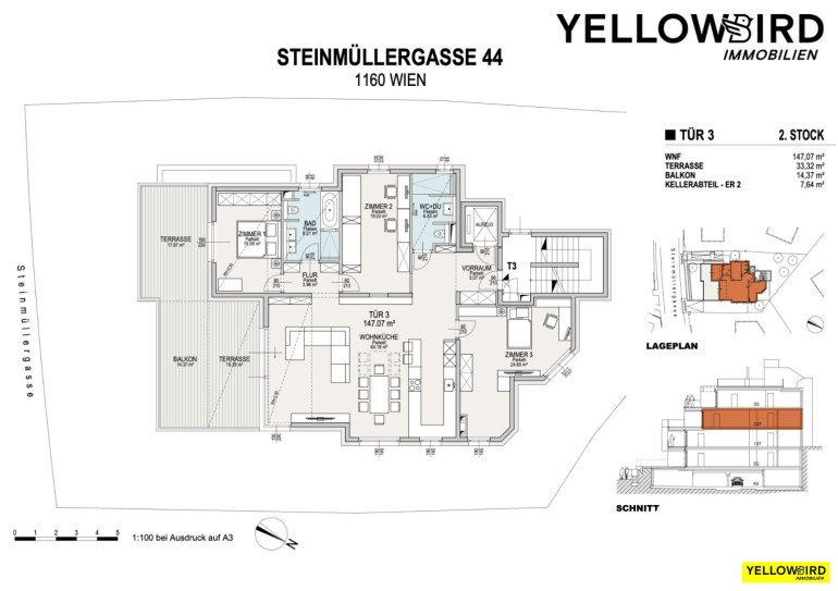 Diese edle 3-Zimmer-Wohnung im 2. Stock überzeugt mit 147 m² Wohnfläche und großzügigen Freiflächen: zwei Terrassen mit insgesamt über 30 m² und einem Balkon laden zum Entspannen im Freien ein.