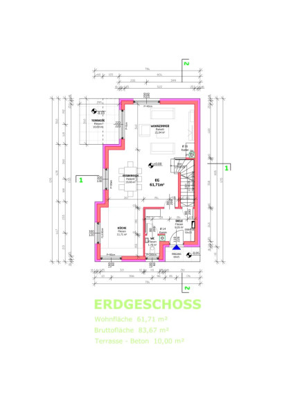 Das Haus besteht aus drei Ebenen mit 67 m² (EG), 61 m² (OG) und 34 m² (Studio) mit vorgelagerter Terrasse nach Südwesten.