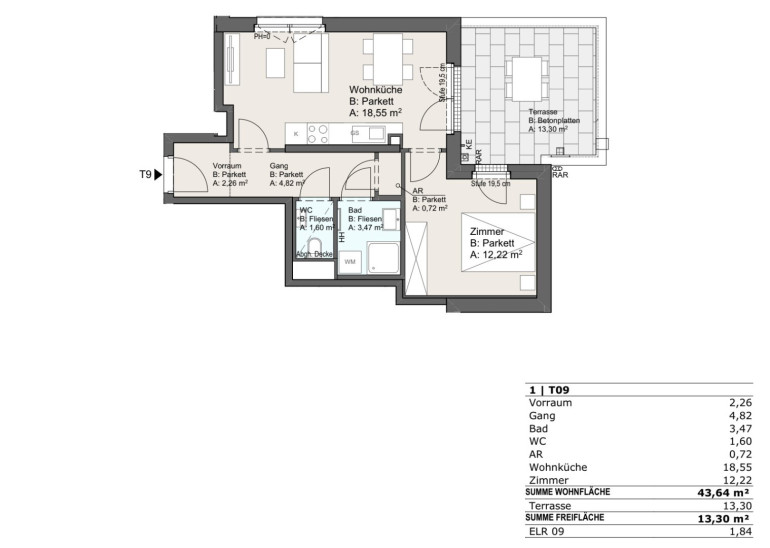 Top 09 | 2 Zimmer | ca. 43,64m² + ca. 13,30 m² Terrasse
