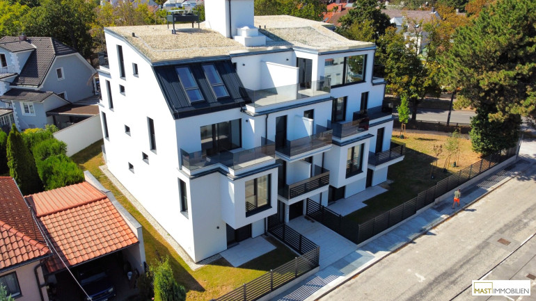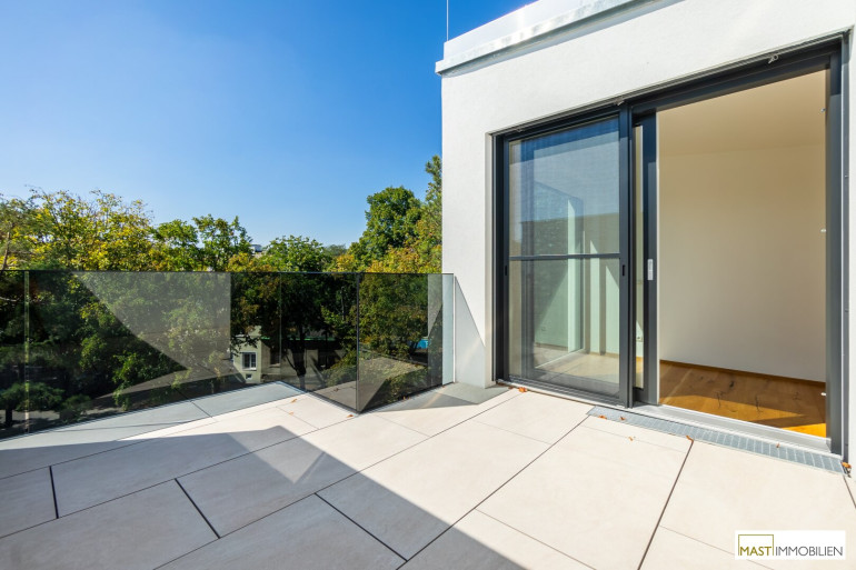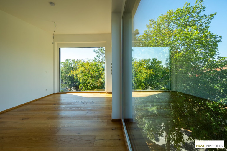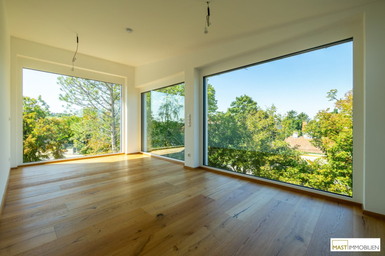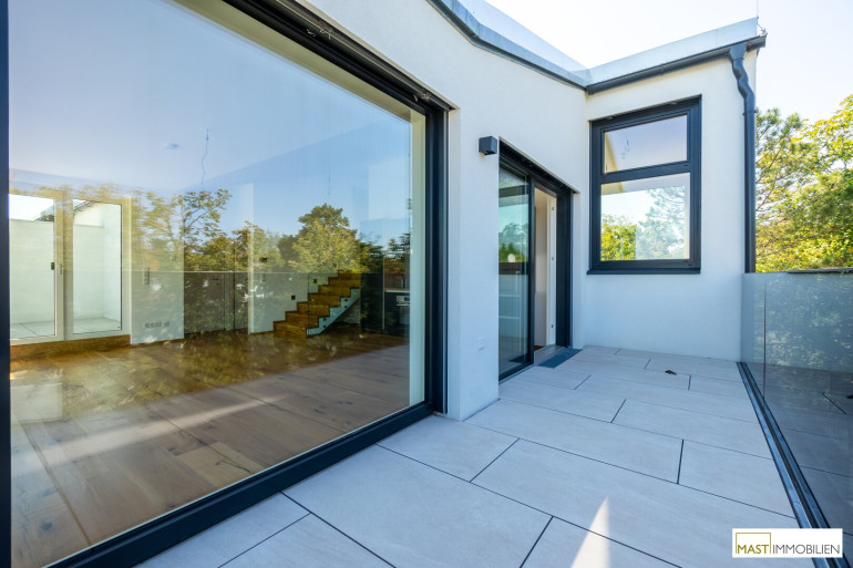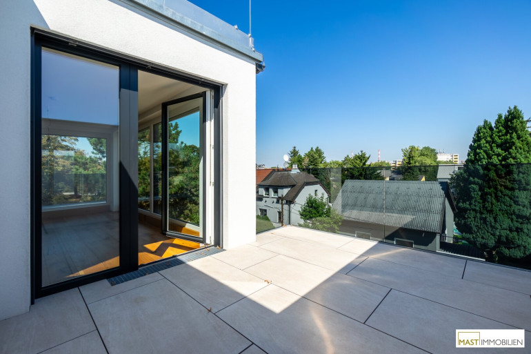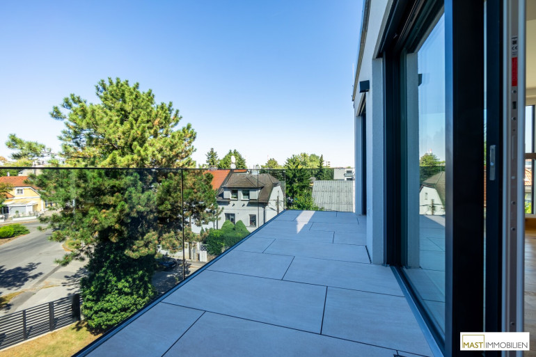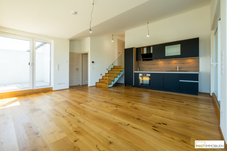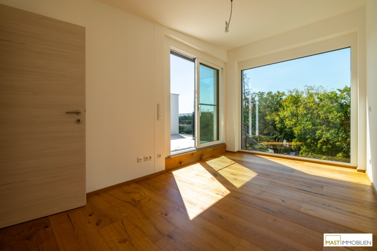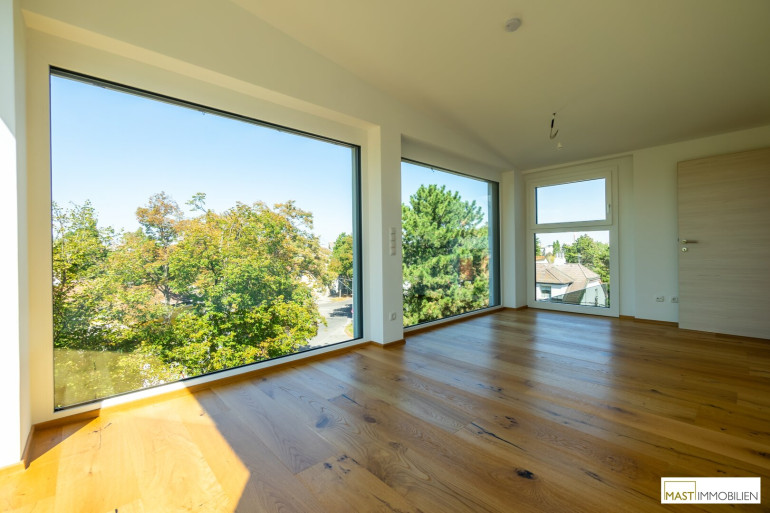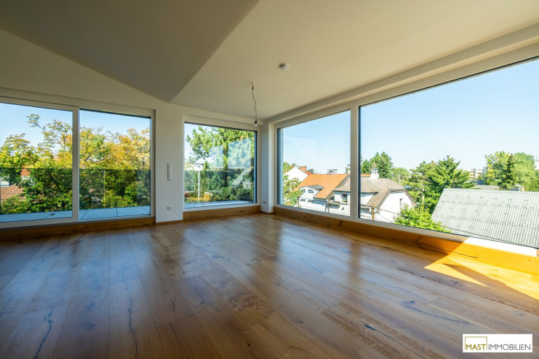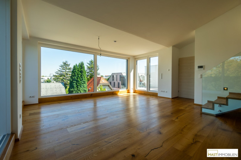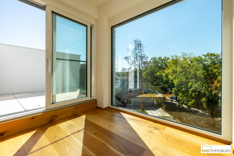 Nach Eintritt in die Wohnung gelangen Sie in ein XXL-Wohnzimmer ausgestattet mit einer hochwertigen Einbauküche inkl. Geräte. Bei dieser Wohnung wurde auf nichts vergessen. Großflächige Fenster bieten einen gigantischen Blick weit über den Dächern Wiens. Über den in der Wohnung vorhanden Aufgang gelangen Sie 2 weitere Schlafräume mit ebenfalls großzügigen Glasflächen, diese lassen sich natürlich über elektrische Raffstores abdunkeln bzw. bieten Ihnen Privatsphäre. Der Zugang auf die östliche Freifläche bietet das kleinere Schlafzimmer, dass sowohl als Kinderzimmer oder Home Office genutzt werden kann. Ein modernes Bad mit ebenerdiger Dusche, Waschbecken und Handtuchheizkörper veredelt das Objekt desto mehr. Das WC mit Waschbecken ist natürlich separat begehbar. Der WM-Anschluss befindet sich im Abstellraum.