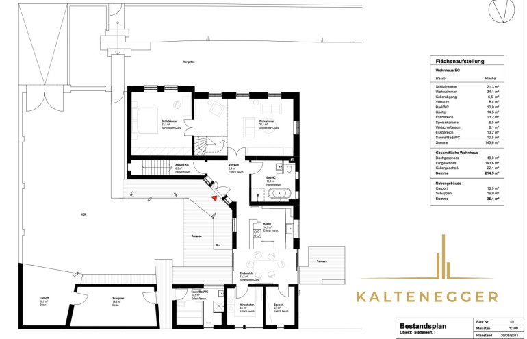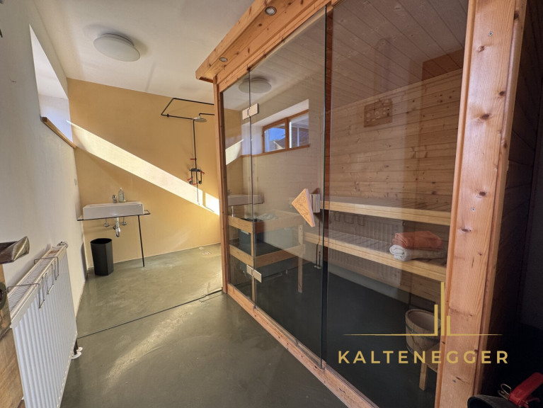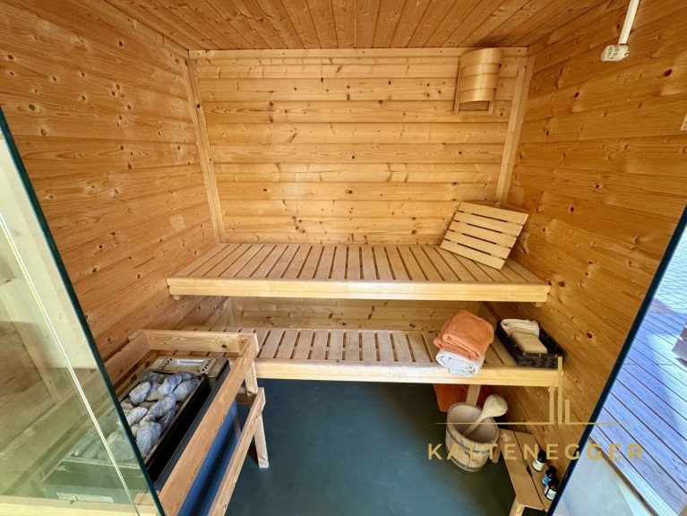Auf großzügiger Wohnfläche stehen derzeit drei Schlafzimmer, ein weitläufiges Wohnzimmer sowie eine repräsentative Wohn- und Essküche zur Verfügung. Ergänzt wird das Raumangebot durch einen Wirtschaftsraum, einen Lagerraum sowie eine separat begehbare Sauna mit eigenem Bad – ein privater Rückzugsort für Entspannung und Erholung.