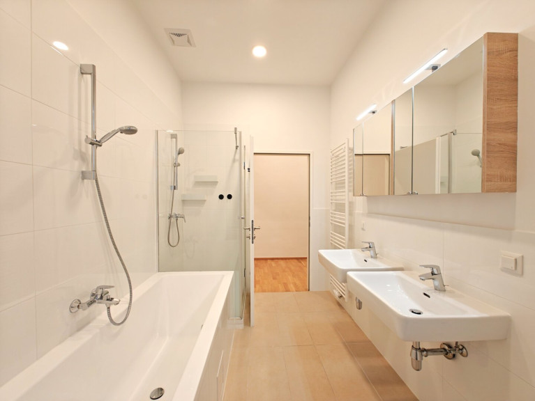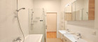 + Badezimmer mit zwei Waschbecken, Dusche, Badewanne, Waschmaschinenanschluss und Fenster
