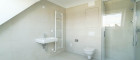 - Badezimmer mit Dusche, Waschbecken, Waschmaschinenanschluss und Toilette