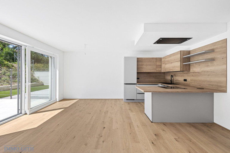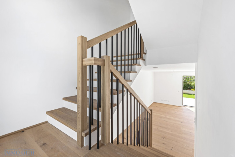 Großzügiger Wohn- und Essbereich mit offener Küche, große Fensterflächen, ca. 20 m² Terrasse und ca. 44 m² Garten mit direktem Anschluss an den Wohnbereich. Gäste-WC, Vorraum, Technikraum und Abstellraum ergänzen diese Ebene.