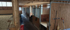 Hohe, gut belüftete Stallhalle mit sichtbarer Holzbalkenkonstruktion