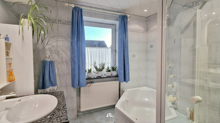 Fliesen, Laminatboden, Parkett, Gas, Kamin, Zentralheizung, Einbauküche, Bad mit Fenster, Badewanne, Dusche, Garage, Parkplatz