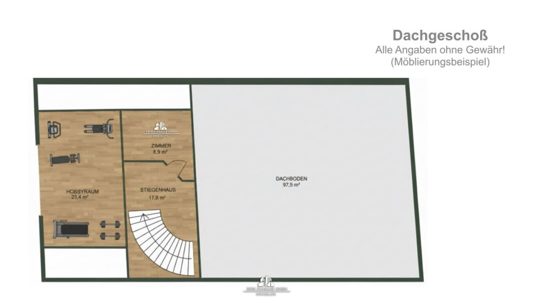 Im Dachgeschoß befinden sich ein großer Hobbyraum, Lagerraum und ein Rohdachboden (ausbaufähig) - siehe auch Pläne im Anhang