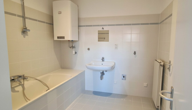 Das angrenzende, sehr große Schlafzimmer ist mit dem Wannenbad verbunden. Im Bad haben Sie die Möglichkeit eine Waschmaschine anzuschließen. Das separate WC ist vom Eingangsbereich über einen offenen Vorraum erreichbar. Der kleine Vorraum eignet sich gut für Stauraum um Staubsauger & Co verschwinden zu lassen.