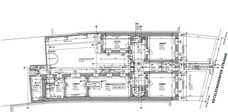 Die Maße wurden entsprechend der vorliegenden vom Architekten erstellten Bestandsplänen übernommen. Eine Haftung für Richtigkeit seitens des Maklerunternehmens von Merveldt Immobilien e.U. kann nicht übernommen werden und sollte bei Bedarf im Einzelfall durch qualifizierte Sachverständige geprüft werden.