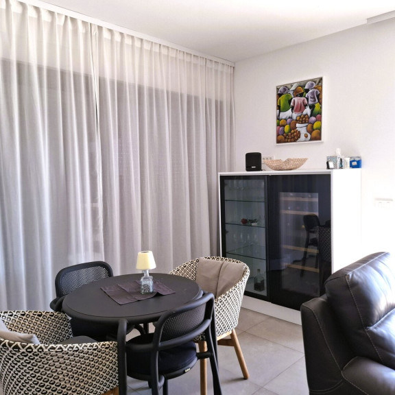 Das lichtdurchflutete Erdgeschoss umfasst ein elegantes Entrée, ein geräumiges Wohnzimmer, eine moderne Küche mit Essbereich und Zugang zur 45 m² großen Terrasse mit Swimmingpool und herrlichem Meerblick.