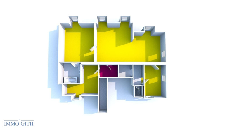 Die Wohnung befindet sich im 3. Stock und bietet 2 großzügige Eingangsbereiche, 1 großes Wohnzimmer, 2 geräumige Schlafzimmer bzw. Bürozimmer, 1 separate Küche, 2 moderne Bäder mit Badewanne und Waschmaschinenanschluss sowie 2 getrennte WCs.