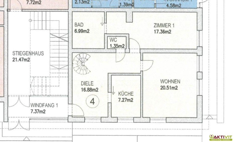 Die Wohnung erstreckt sich über zwei Ebenen mit einer Gesamtwohnfläche von ca. 150 m². Im Erdgeschoss stehen rund 70 m² zur Verfügung, bestehend aus zwei Schlafzimmern, einer Küche, einem Badezimmer, einem separaten WC sowie einer zentralen Diele mit Wendeltreppe in das Obergeschoss.