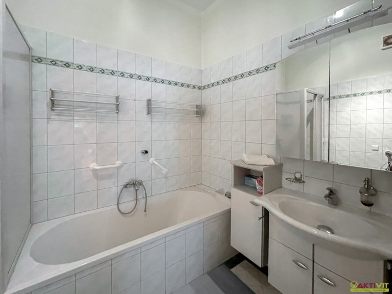 Fliesen, Parkett, Fernwärme, Zentralheizung, Einbauküche, Badewanne, Dusche, Garage, Sauna
