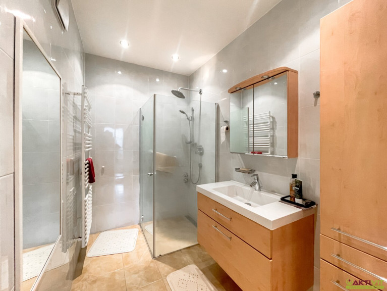 Zur Wohnung gehören zudem eine großzügige Doppelgarage mit ca. 35 m² und ein Kellerabteil mit Sauna, Dusche sowie einem Kühlraum – ideal für zusätzlichen Stauraum und private Wellness-Momente.