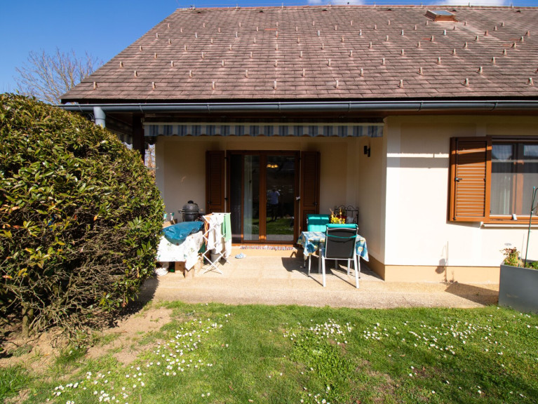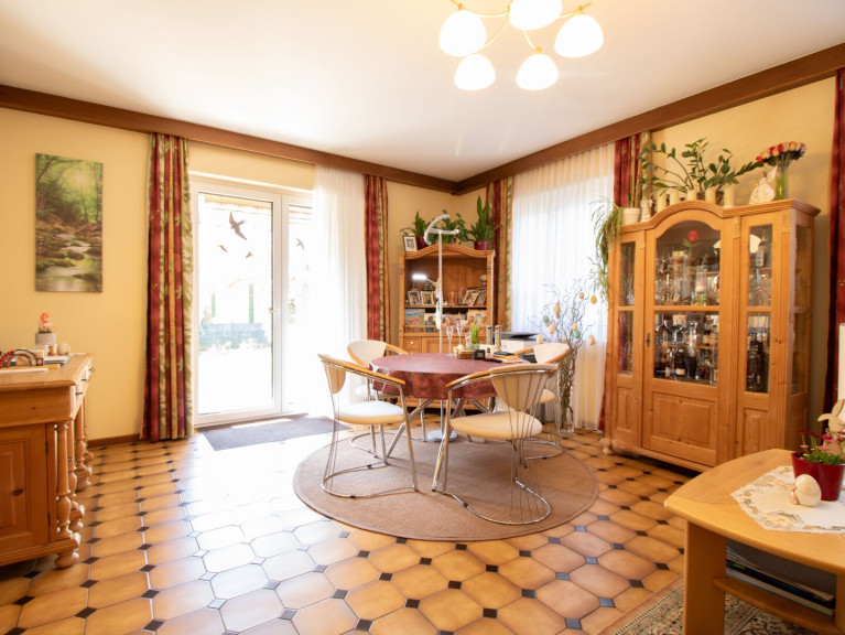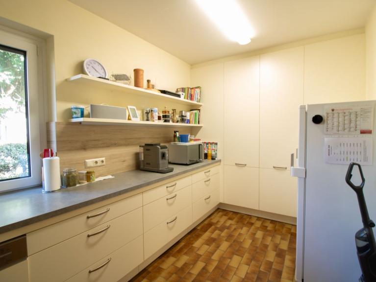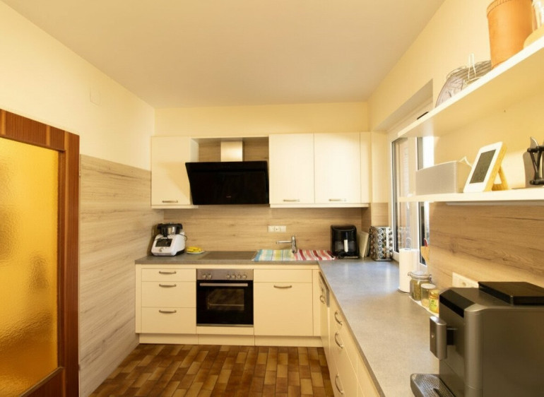 Der lichtdurchflutete Wohnbereich mit direktem Zugang zur Terrasse und zum Garten lädt zum Entspannen ein. Ob gemütliche Stunden im Grünen oder gesellige Abende – hier genießen Sie Ruhe und Privatsphäre. Die moderne Küche fügt sich harmonisch ins Wohnkonzept ein und bietet optimale Voraussetzungen für kulinarische Genüsse.