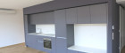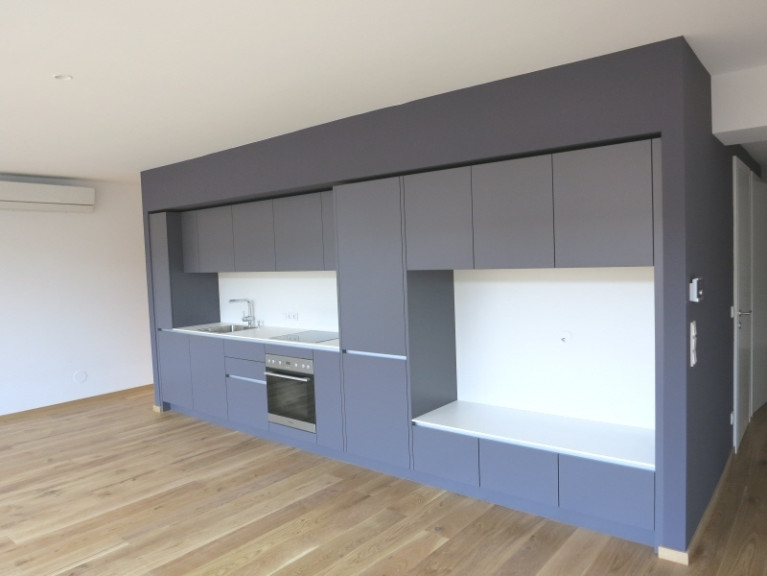 Vorraum mit Gästetoilette und Wirtschaftsraum, Wohnzimmer mit offener Küche und Ausgang auf Terrasse (ca. 16 m²), Schlafzimmer mit Zugang zum Duschbad.