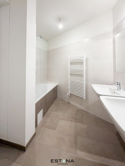 - Badezimmer mit Badewanne, Doppelwaschbecken und Waschmaschinenanschluss