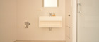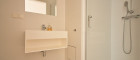 Im hinteren Bereich der Wohnung ist das moderne Badezimmer mit verglaster Dusche, Waschtisch, Handtuchheizkörper und Waschmaschinenanschluss situiert.