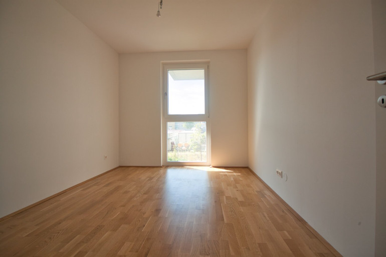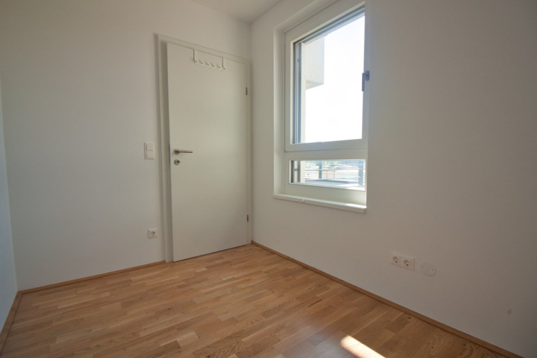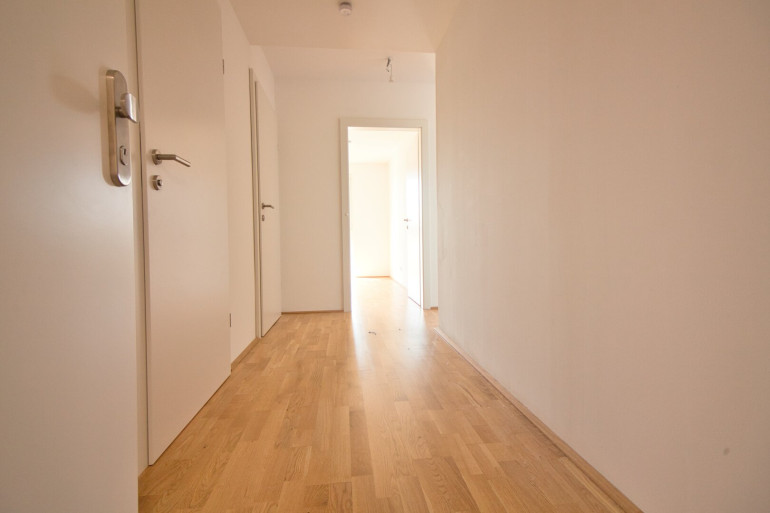 Die Wohnung befindet sich im 4. Liftstock eines modernen Wohnhauses aus dem Jahr 2021. Der großzügige Flur bietet ausreichend Platz zum Ankommen. Linker Hand befindet sich ein separates WC mit Handwaschbecken. Ein Abstellraum sorgt für zusätzlichen Stauraum. Geradeaus geht es ins ca. 11 m² große, westlich orientierte Schlafzimmer.