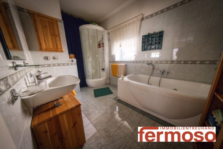 Fliesen, Parkett, Heizofen, Bad mit Fenster, Badewanne, Dusche, Sauna