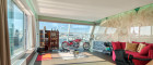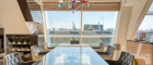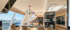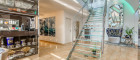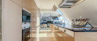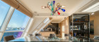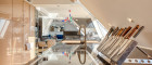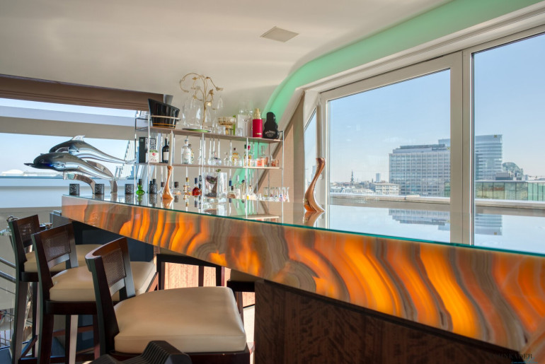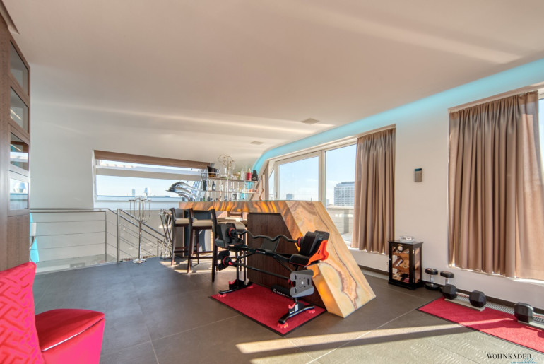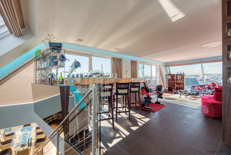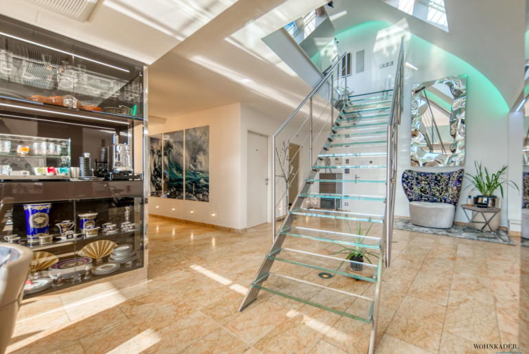 Die Architektur des Penthouse besticht durch ihre offene und schlichte Gestaltung. Der großzügige Wohnraum mit Leseecke, Essbereich und Küche bildet das Zentrum der Wohnung. Von hier aus gelangen Sie zentral zu einem Gäste-WC, Abstellräumen und den zwei Schlafzimmern. Eine originelle Glastreppe führt Sie in das 50 m² große Masterbedroom, das derzeit als Bar und Fitnessraum genutzt wird. Die Bar wurde aus exklusivem Onyx gefertigt. Von hier aus erreichen Sie die weiteren Terrassenbereiche mit Jacuzzi, BBQ-Bereich und Sonnenliegefläche. Der Speiselift ermöglicht Ihnen einen bequemen Zugang zu jeder Etage.