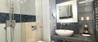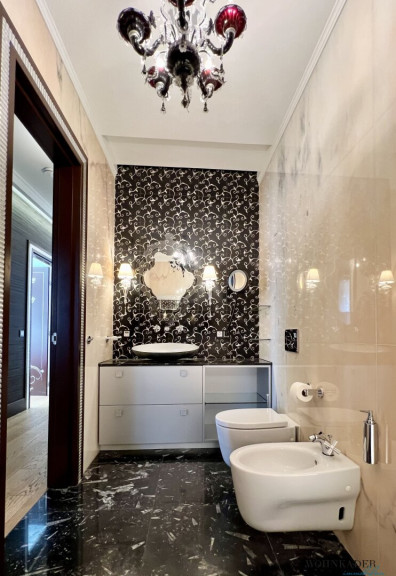 В прихожей есть просторный гардероб. Одна из ванных комнат оформлена с душем, туалетом и раковиной. Вторая ванная комната предлагает гидромассажную ванну, элегантный туалетный столик с зеркалом Murano и захватывающую люстру из оригинального стекла Murano, висящую с потолка в центре ванной комнаты.